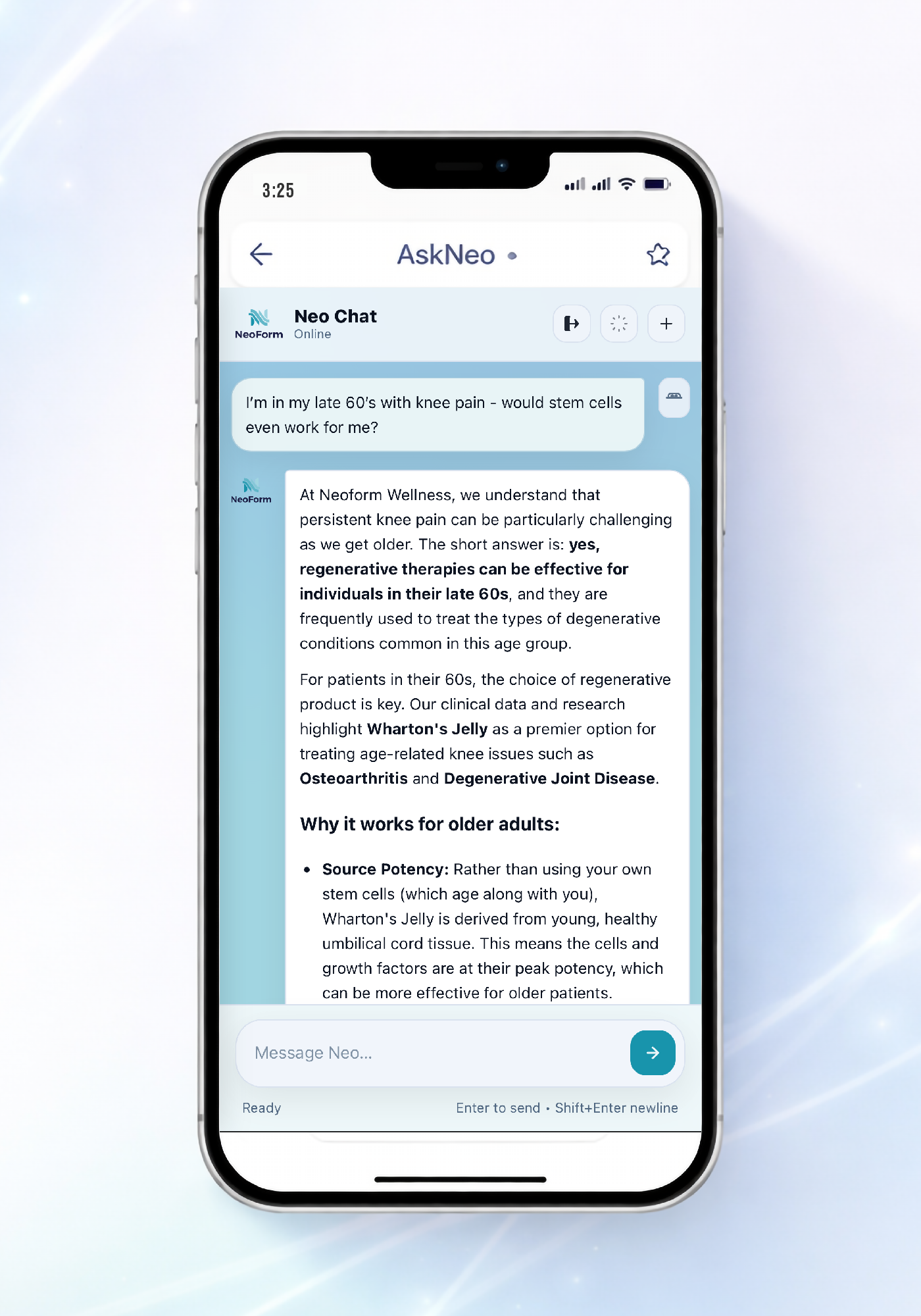 AskNeo is an interactive tool designed to give you straightforward, accurate answers to the most common (and uncommon) questions about regenerative therapy—without the confusion, pressure, or overwhelm that often comes with this topic.